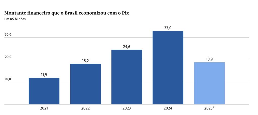 Desde que foi criado pelo Banco Central no final de 2020, o Pix já gerou uma economia estimada de R$ 106,7 bilhões para brasileiros. Só no primeiro semestre de 2025, a redução de custos chegou a R$ 18,9 bilhões, segundo cálculo inédito do MBC (Movimento Brasil Competitivo).