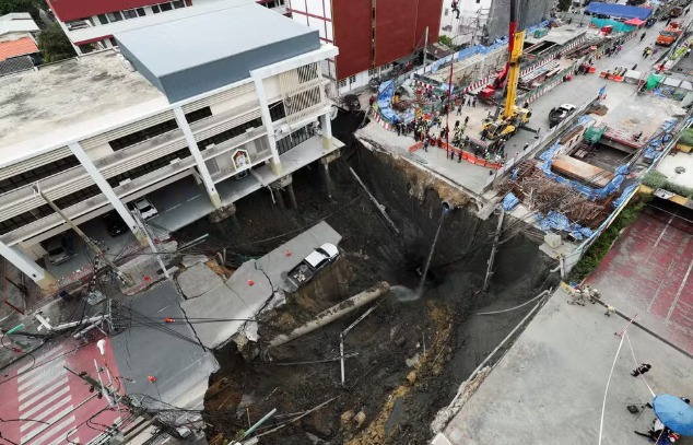 O primeiro-ministro tailandês, Anutin Charnvirakul, disse a repórteres que a terra proveniente de uma obra do metrô estava deslizando, o que causou a cratera.