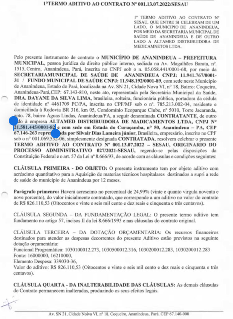 A Altamed assinou contratos que ultrapassam a casa dos R$ 2 milhões com a Prefeitura de Ananindeua. Um dos aditivos recentes, firmado na gestão de Daniel Santos (MDB), somou mais de R$ 800 mil.