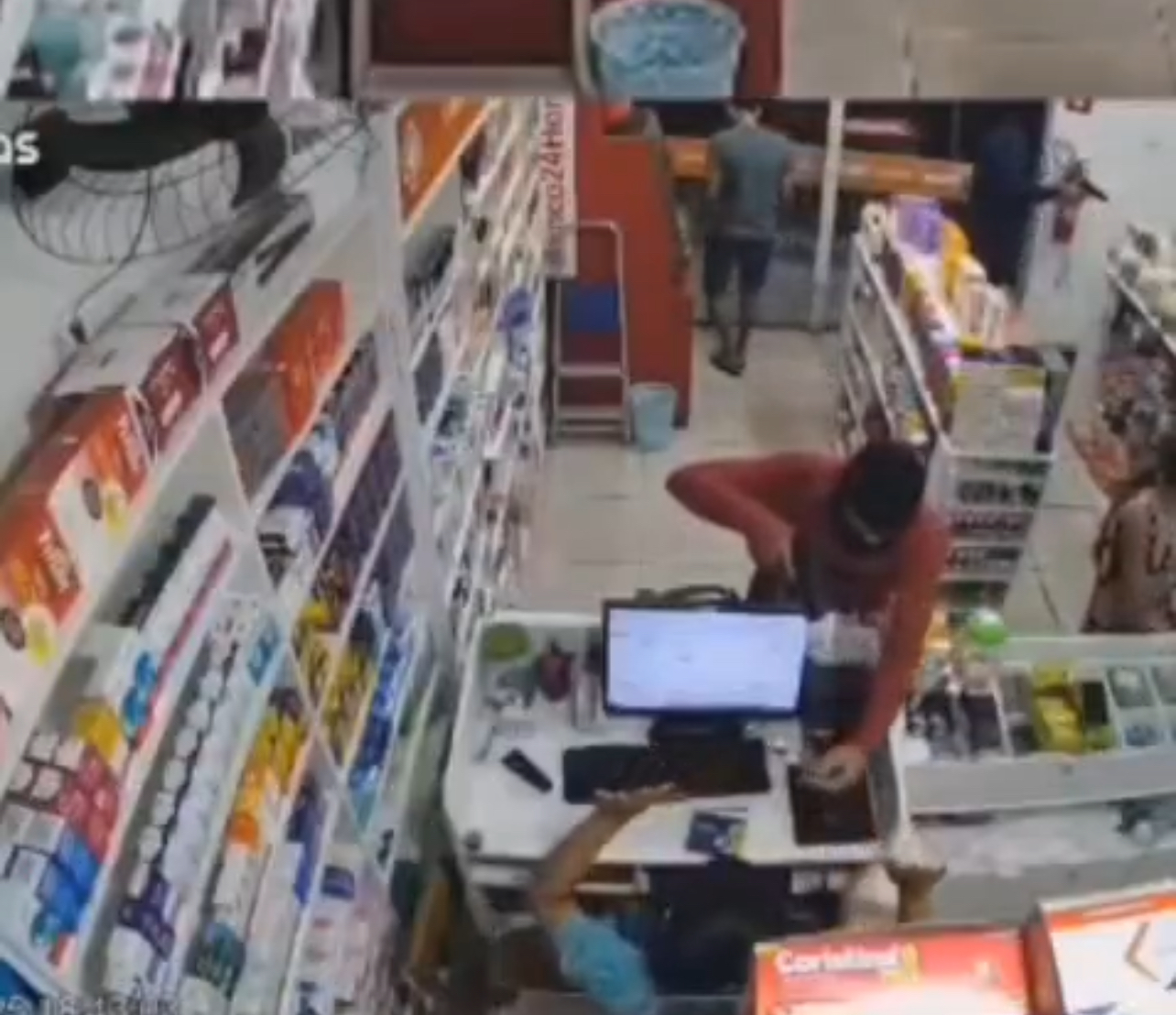 O primeiro alvo foi a Farmácia Mais Saúde. Câmeras de segurança flagraram a ação, mostrando os bandidos entrando rapidamente no local, rendendo a funcionária do caixa e levando todo o dinheiro arrecadado no dia. Nas imagens, é possível ver a violência da abordagem e a fuga logo após o crime.