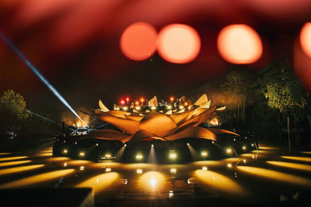 O palco, construído em formato de vitória-régia, tinha cerca de 25 metros de diâmetro e pesava mais de 80 toneladas, sendo montado diretamente sobre o leito do rio.