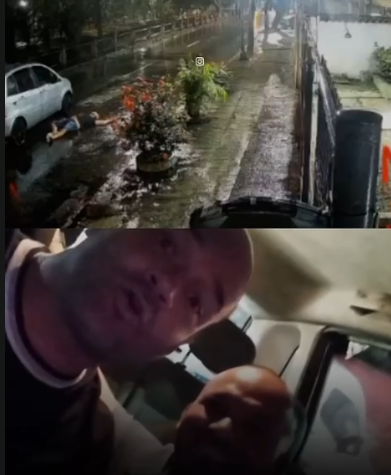 Na queda, ainda bate com a cabeça na porta do carona, que com a força acaba fechando.