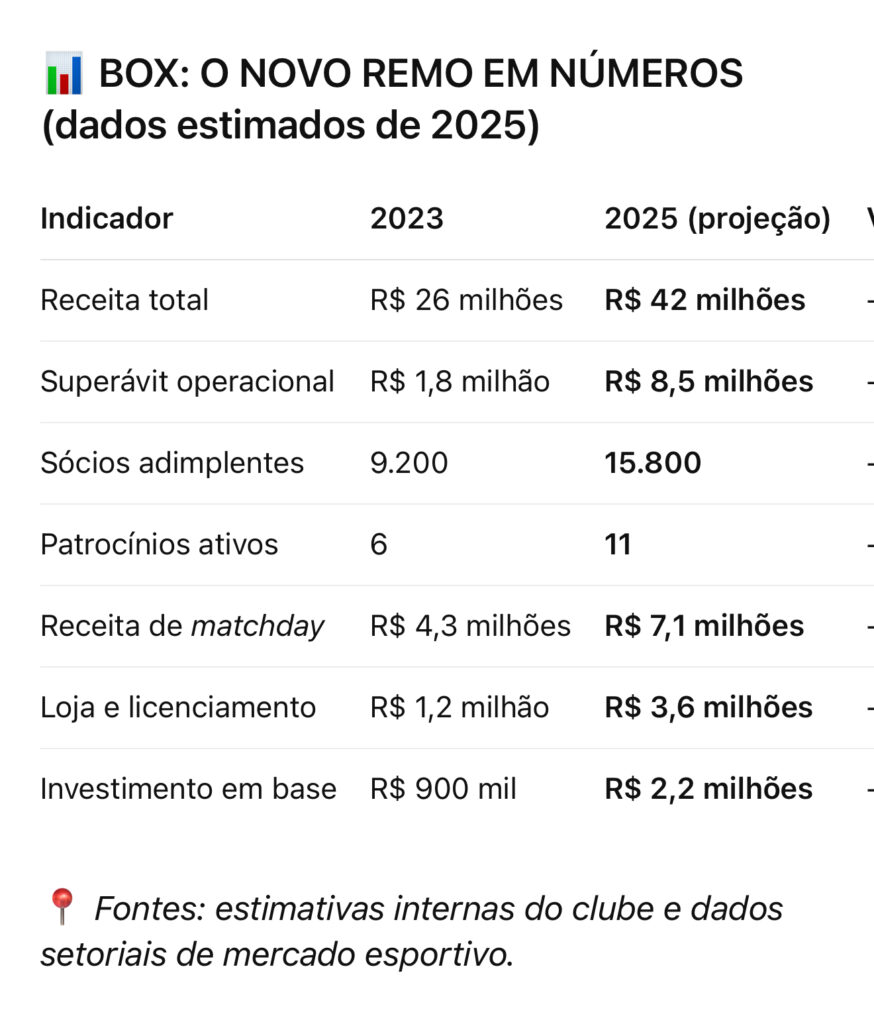 Atualmente, o Remo registra índices recordes de adimplência no Sócio-Torcedor e um crescimento de mais de 30% nas receitas comerciais em relação a 2023, segundo estimativas internas. Além disso, o clube vem atraindo novas marcas para o mercado do Norte, algo que há poucos anos parecia inviável.