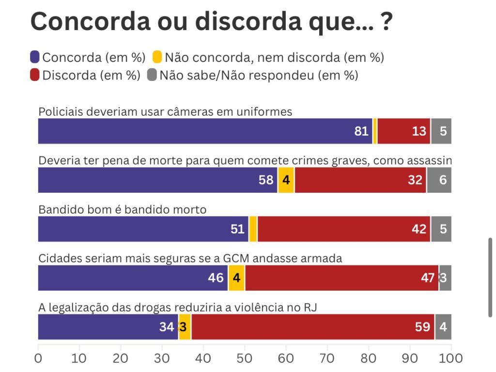 No estado do Rio de Janeiro, 51% da população concorda com a frase “bandido bom é bandido morto”, enquanto 42% discordam. É o que mostra pesquisa Genial/Quaest divulgada nesta segunda-feira (3).