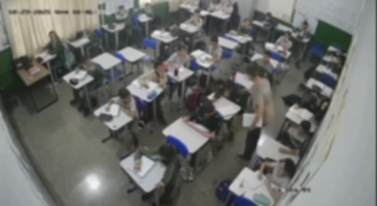 Ele recolhe o objeto, bate com força na mesa de outro aluno e, logo depois, parte para cima de um estudante, desferindo tapas em seu rosto.