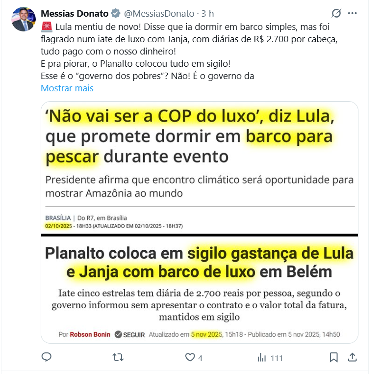 “Gastança de Lula e Janja com barco de luxo em Belém está sob sigilo. O Iate de cinco estrelas tem diária de 2.700 reais por pessoa, o barco foi alugado de última hora para satisfazer as exigências do socialista de iPhone. Uma aventura naval financiada pelo nosso dinheiro suado!”, escreveu o deputado na rede social X.