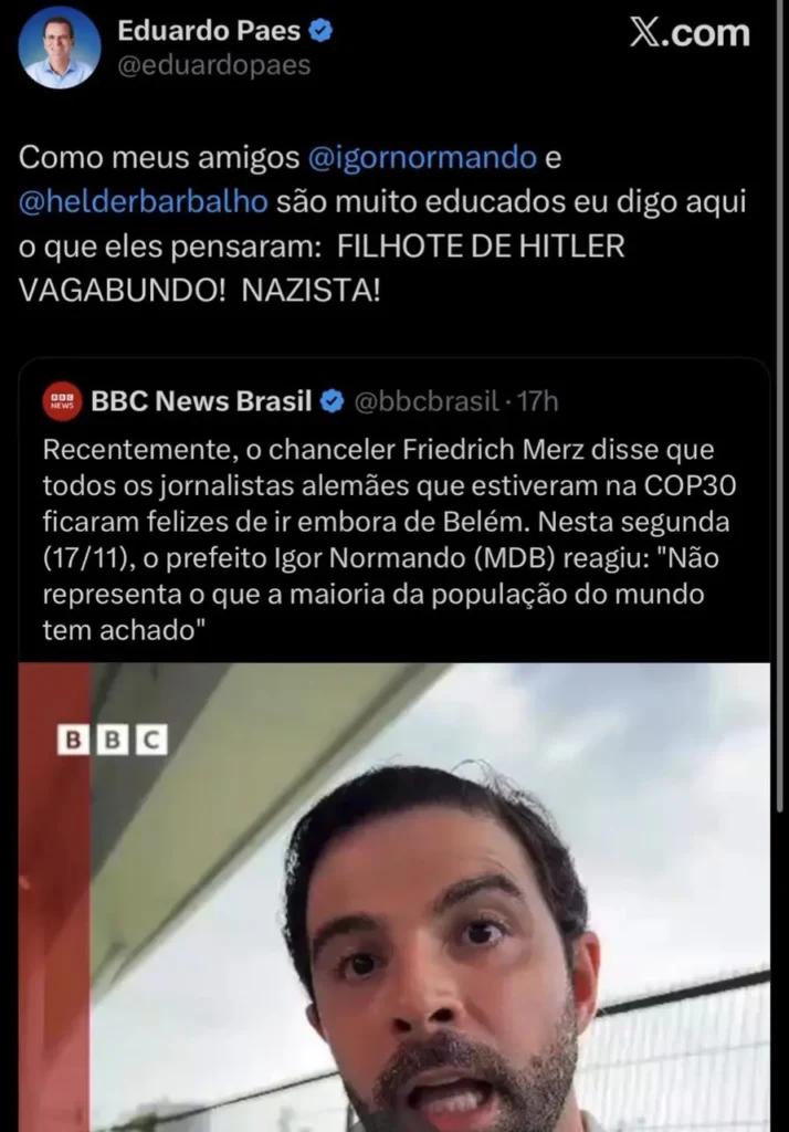 Em resposta, Paes criticou Merz e o chamou de “filhote de Hitl3r” e de “nazist4”. A referência foi ao ex-ditador Adolf Hitl3r. “Como meus amigos Igor Normando e Helder Barbalho são muito educados, eu digo aqui o que eles pensaram: FILHOTE DE HITL3R VAGABUND0! NAZIST4!”, escreveu Paes.