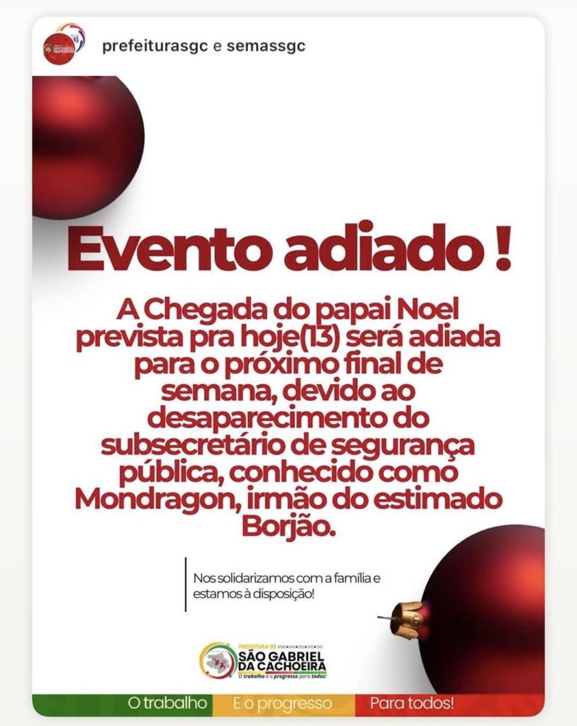 Diante da gravidade da situação, a Prefeitura de São Gabriel da Cachoeira divulgou nota oficial confirmando o desaparecimento e anunciou o adiamento da chegada do Papai Noel, que estava prevista para este sábado (13). O evento foi transferido para o próximo final de semana, em respeito ao momento delicado vivido pela família e pela comunidade.