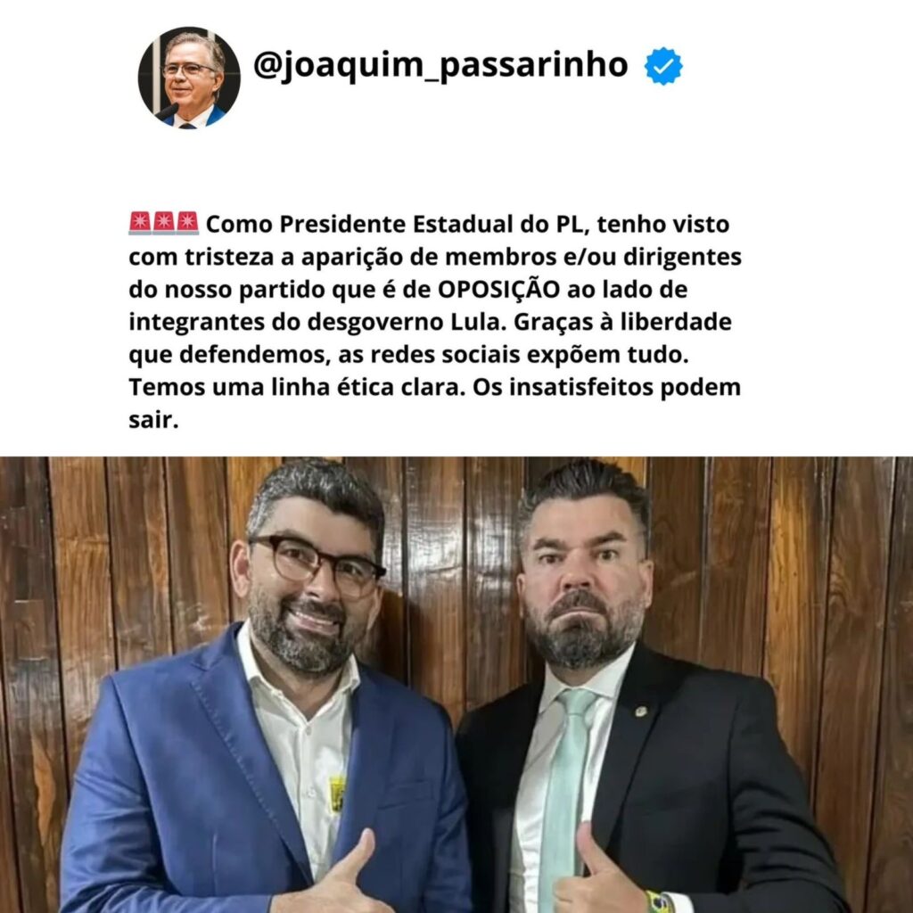 Uma publicação feita pelo presidente estadual do PL no Pará, Joaquim Passarinho, movimentou os bastidores da política local e gerou forte repercussão nas redes sociais. O recado público, considerado por muitos como uma indireta, teria como alvo deputados da própria base que vêm demonstrando aproximação com aliados do governo Lula, entre eles o prefeito Daniel Santos.