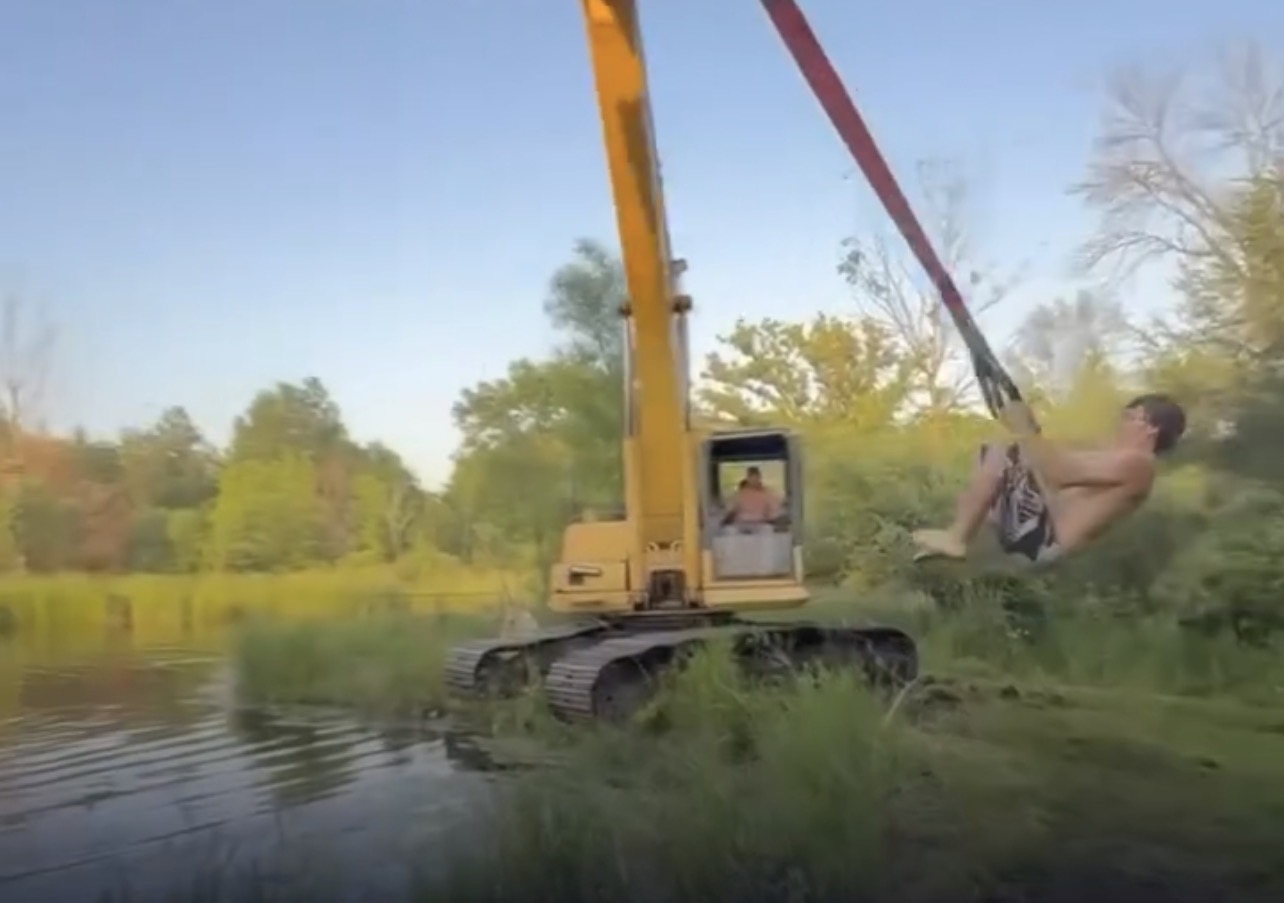 Nas imagens, o homem aparece segurando uma corda presa à máquina pesada, que gira com o objetivo de lançá-lo na água, como se fosse um salto improvisado. A situação, no entanto, foge do controle quando ele perde o momento certo de se soltar.