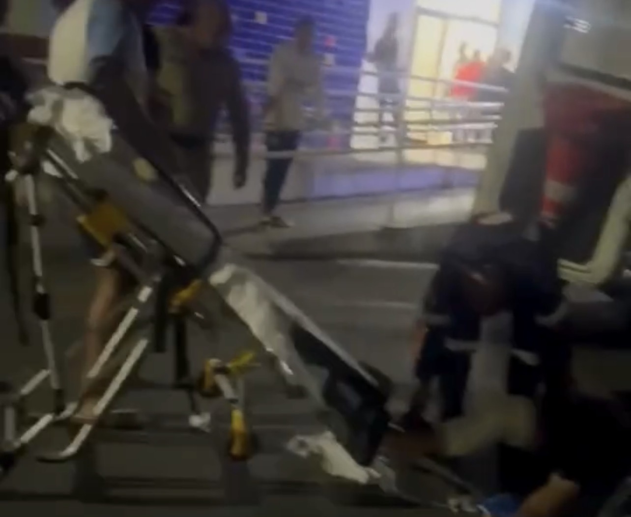 As imagens mostram a maca em posição vertical e o paciente caído no chão, gritando de dor, enquanto parentes acusam a equipe de negligência durante a transferência.