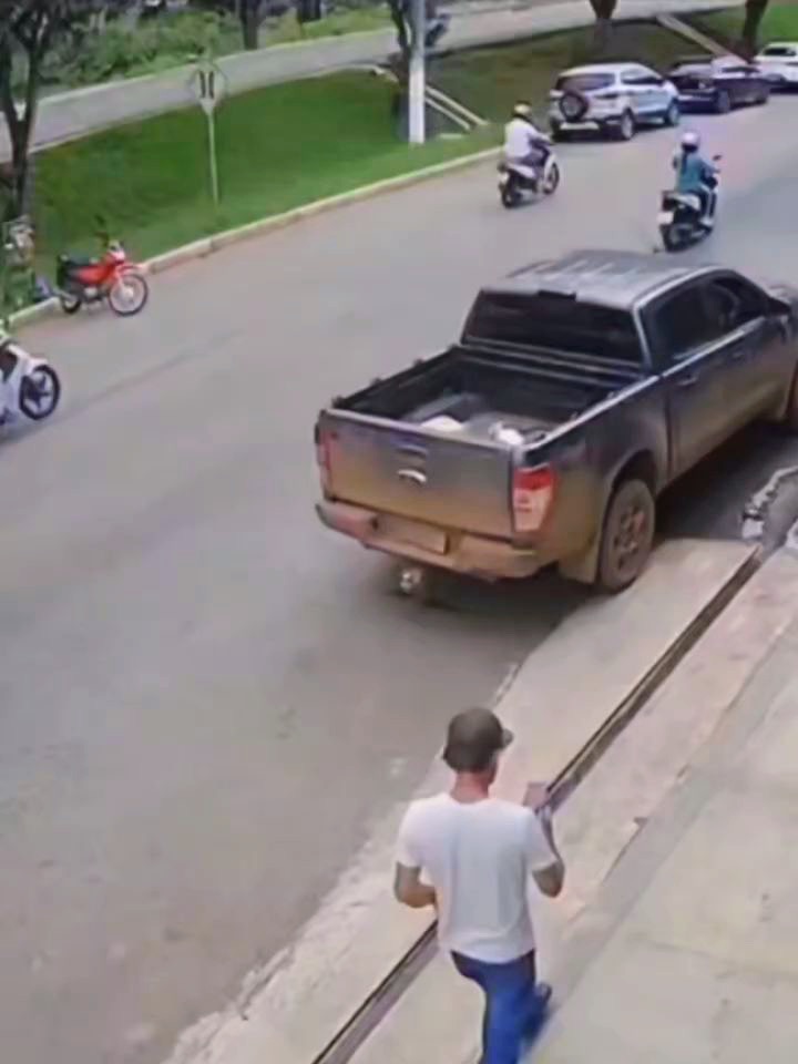 Nas imagens, é possível ver a vítima com o celular na mão, prestes a entrar no veículo, quando um caminhão passa ao lado com uma das portas abertas e acaba atingindo sua cabeça. O impacto causa um grande susto, mas, aparentemente, o homem não sofreu ferimentos graves.