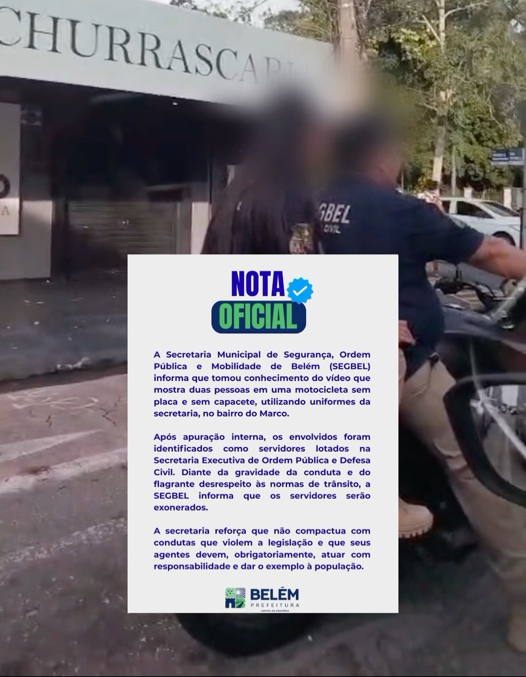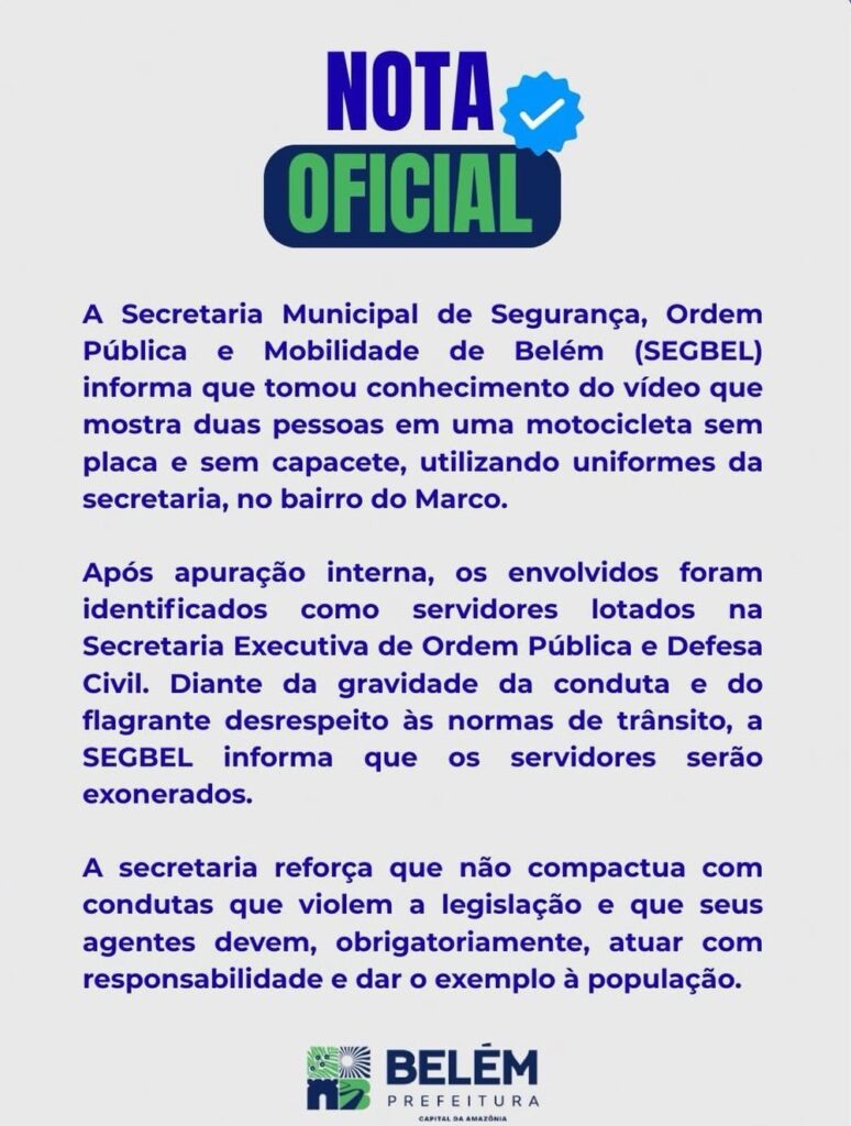 Em nota oficial divulgada pela Secretaria Municipal de Segurança, Ordem Pública e Mobilidade de Belém (SEGBEL), a pasta informou que tomou conhecimento do vídeo e instaurou uma apuração interna para identificar os envolvidos. Após a verificação, foi confirmado que se tratavam de servidores lotados na Secretaria Executiva de Ordem Pública e Defesa Civil.