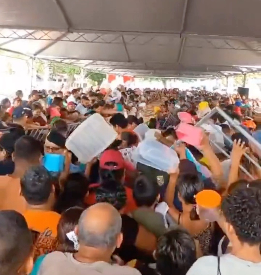 Nas imagens, é possível ver dezenas de pessoas invadindo o espaço, utilizando baldes, empurrando umas às outras e gritando, o que rapidamente desorganizou o evento. O bolo foi puxado à força, derrubado e disputado em meio ao tumulto, diante do espanto de quem acompanhava a comemoração.