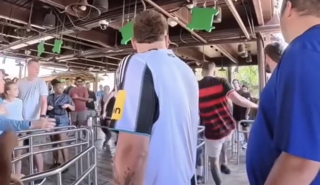 Uma confusão entre visitantes em um parque de diversões nos Estados Unidos ganhou repercussão nas redes sociais após imagens mostrarem dois homens trocando agressões em meio ao público.