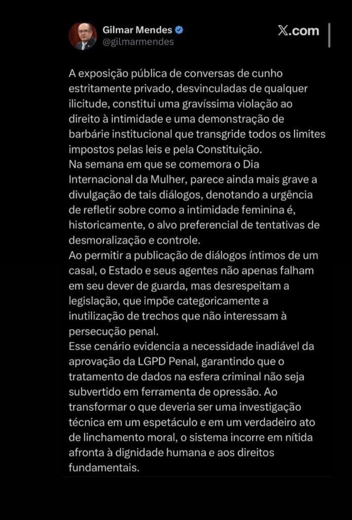 A manifestação foi feita na plataforma X. Na publicação, o ministro classificou a exposição de conversas pessoais como uma “b4rbárie institucional” e afirmou que cabe ao Estado proteger a intimid4de das pessoas. Mendes também mencionou o Dia Internacional da Mulher ao argumentar que a exposição da intimid4de feminina, historicamente, tem sido usada como forma de desmor4lização.