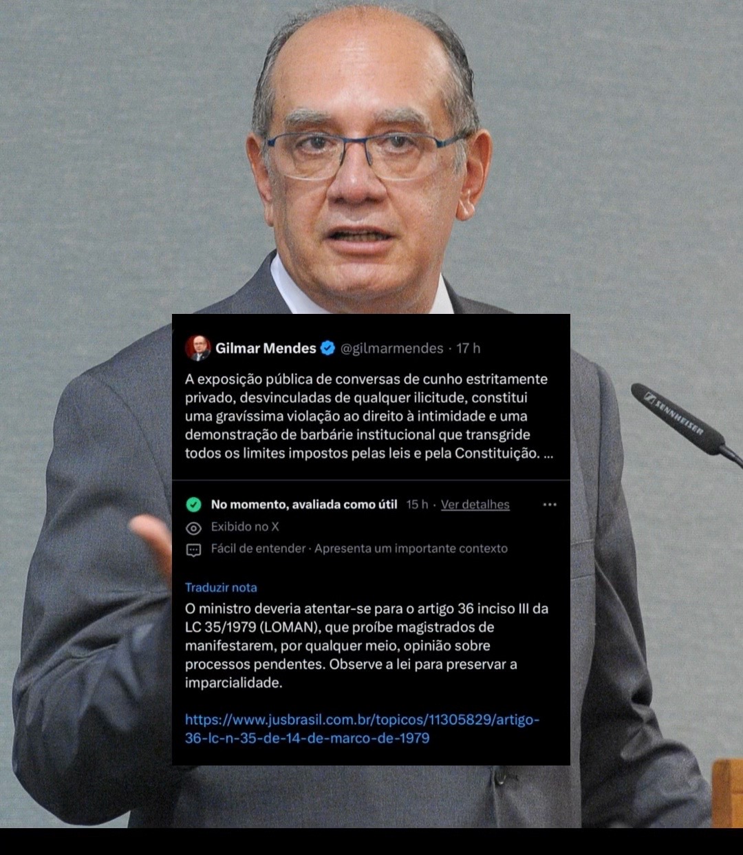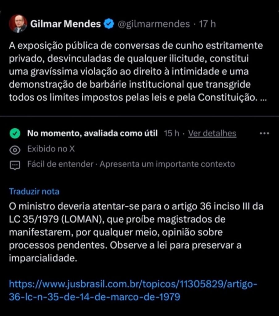 Apesar da crítica, a própria plataforma exibiu uma nota de contexto abaixo da postagem lembrando que a Lei Orgânica da Magistratura Nacional proíbe magistrados de comentarem publicamente processos que ainda estejam em andamento. A regra existe para preservar a imparcialidade e evitar manifestações que possam influenciar o julgamento.