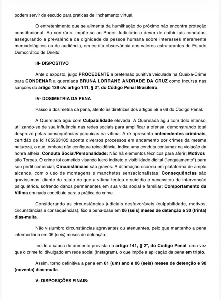 Sentença que condenou Bruna Lorrane a 1 ano e 6 meses de prisão pelo crime de difamação