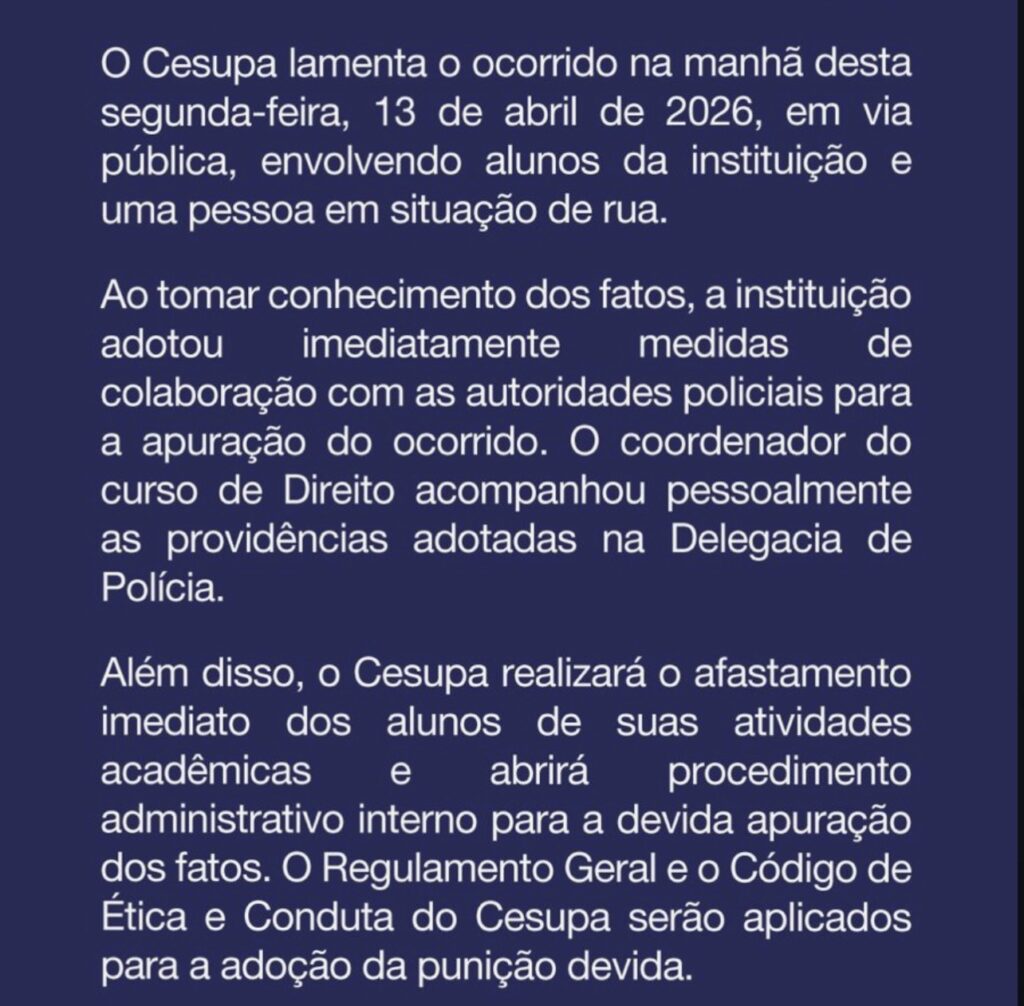 Em nota, a instituição informou que lamenta o ocorrido, registrado em via pública, e que adotou medidas imediatas após tomar conhecimento dos fatos. Entre as providências, está a colaboração com as autoridades policiais na apuração do caso. Segundo o comunicado, o coordenador do curso de Direito acompanhou os desdobramentos na delegacia.