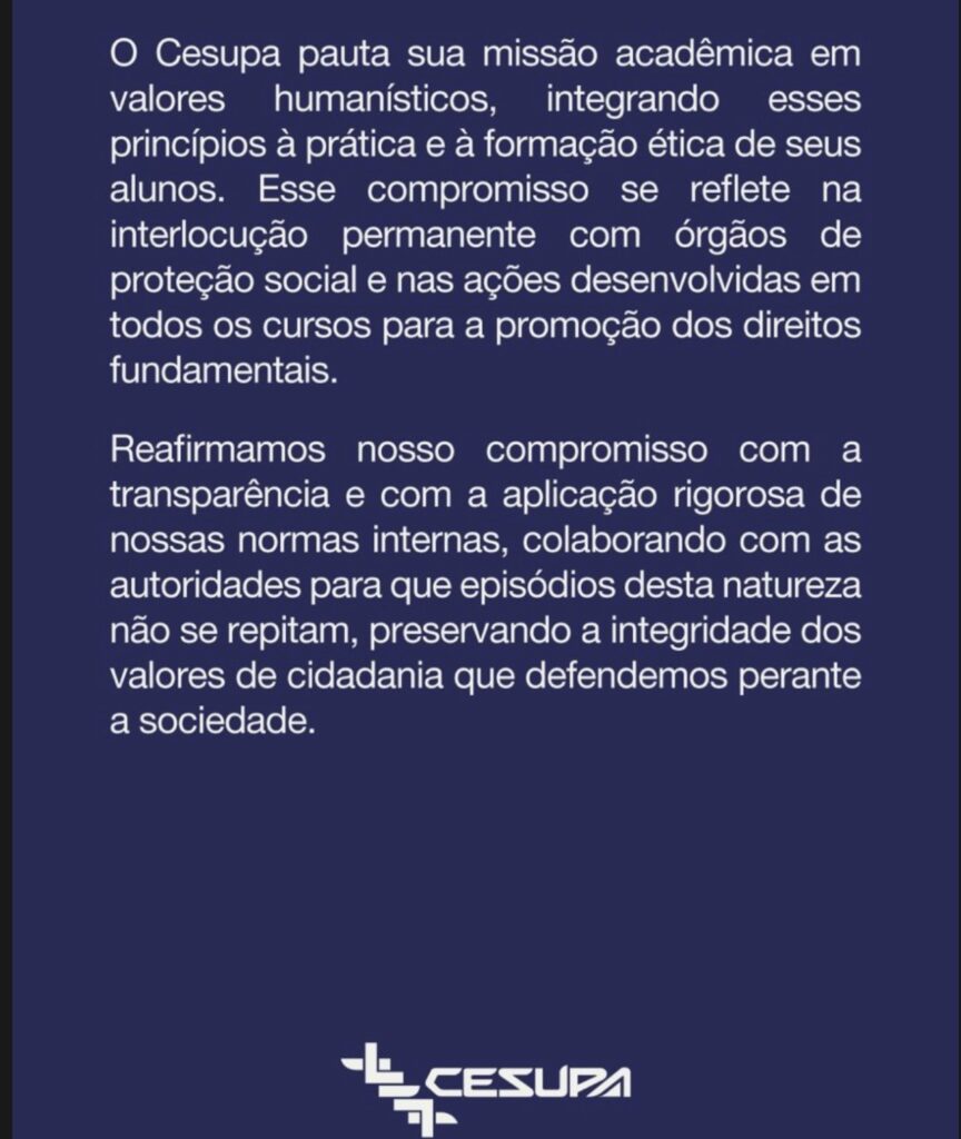 O CESUPA também anunciou o afastamento imediato dos alunos envolvidos de suas atividades acadêmicas e a abertura de um procedimento administrativo interno para investigar o episódio. A instituição destacou que o Regulamento Geral e o Código de Ética e Conduta serão aplicados para definição das possíveis punições.